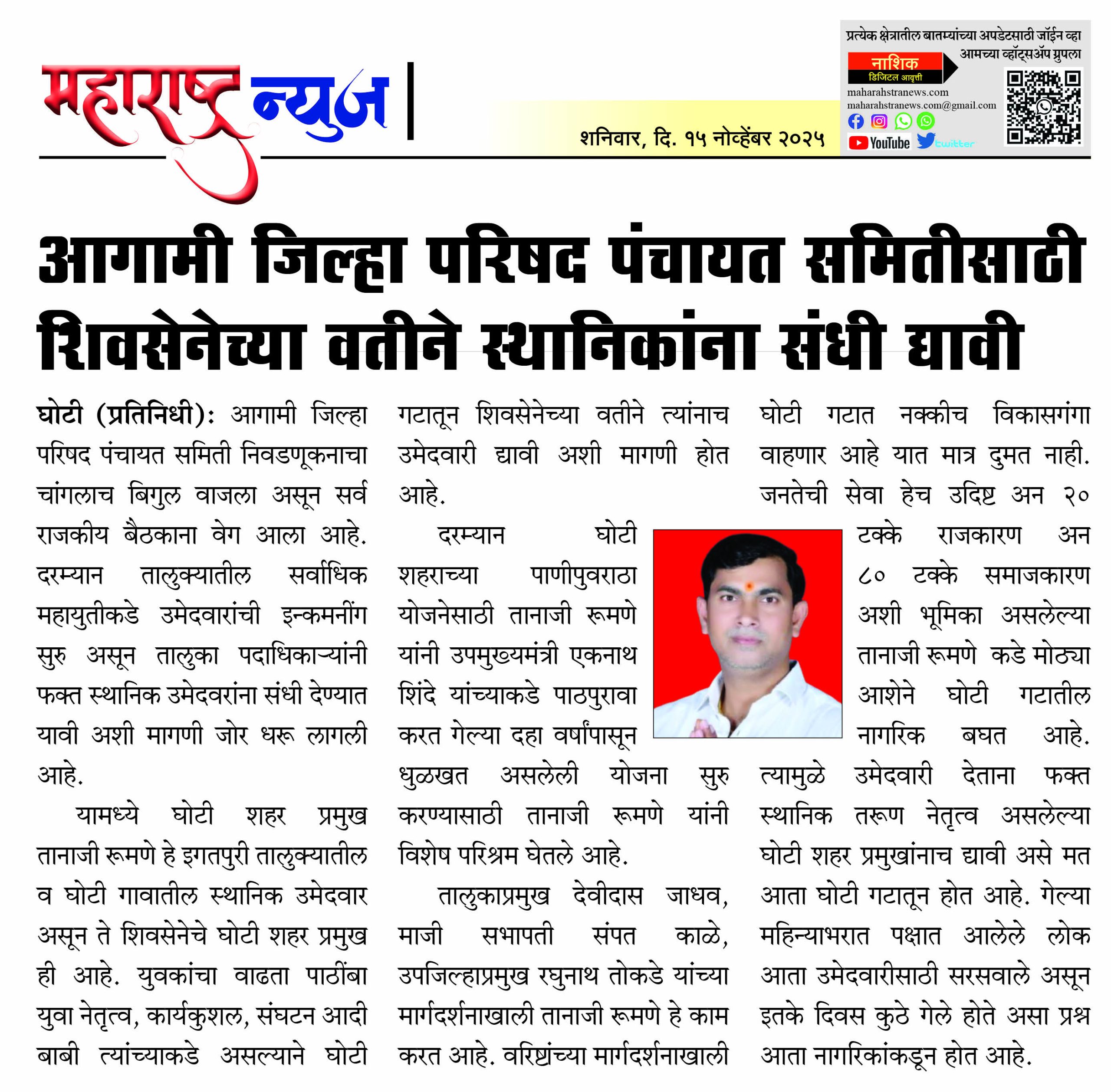 यामध्ये घाेटी शहर प्रमुख तानाजी रूमणे हे इगतपुरी तालुक्यातील व घाेटी गावातील स्थानिक उमेदवार असून ते शिवसेनेचे घाेटी शहर प्रमुख ही आहे. युवकांचा वाढता पाठींबा युवा नेतृत्व, कार्यकुशल, संघटन आदी बाबी त्यांच्याकडे असल्याने घाेटी गटातून शिवसेनेच्या वतीने त्यांनाच उमेदवारी द्यावी अशी मागणी हाेत आहे.